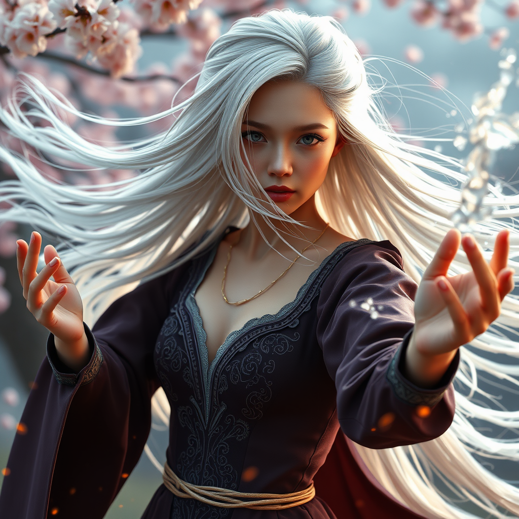 Create a photorealistic image of a striking young female wizard with flowing white hair caught in the wind. She possesses a perfectly structured face adorned with an award-winning hairstyle, emphasizing realistic hair textures. The setting exhibits qualities of high-definition art seen on platforms like DeviantArt and ArtStation, inspired by fashion world aesthetics. The wizard's belly-free dress features intricate designs that highlight her detailed face and body. The photography employs advanced techniques like ray tracing and backlighting for a cinematic effect. Her intense gaze meets the viewer, framed by glowing embers and a cherry blossom backdrop that reflects elements of Japanese culture. In an action pose, her hands are elevated to a right angle, generating a dynamic splash of water and mist. The image benefits from digital artistry and hand-drawn elements rendered in software such as Cinema 4D and Blender, delivering an atmospheric and sensual visual in 12k ultra-realistic quality. Creative input from noted artists like Grzegorz Rutkowski, Artgerm, and Alphonse Mucha is evident, weaving detailed textures and vivid colors into the composition. The artwork, also a technical masterpiece, displays ultra-realistic elements and sharp focus achieved through tools like Unreal Engine, emphasizing a highly developed depth of field. With extraordinary attention to detail, the wizard's realistic skin and flowing dress add to the hyper-realism and cinematic allure, encapsulating an award-winning photograph with graceful poise and intricate artistry.