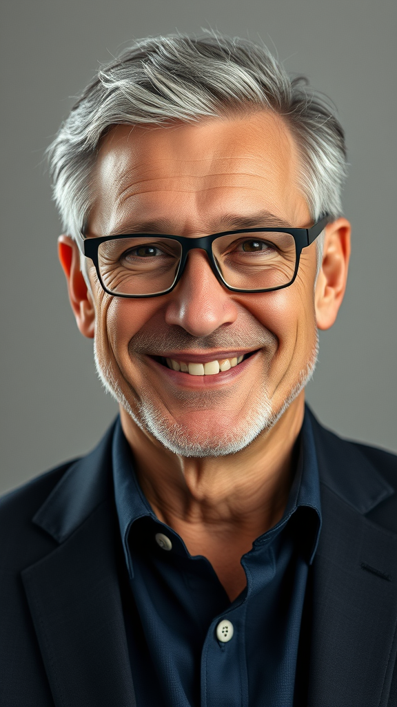 Create a photorealistic portrait of a middle-aged adult male exuding wisdom and warm confidence. His captivating presence is a fusion of experience and open friendliness, with a smile that reflects deep understanding and gentle kindness. His hair, speckled with grey, is neatly styled in an effortless, dignified manner, suggesting a man attentive to his appearance without vanity. Perched on his nose are modern, rectangular glasses with a subtle frame, enhancing his scholarly yet approachable look. They highlight his warm, deep brown eyes, which brim with stories, inviting others into his world with a mere glance. He wears a sharp, dark blazer conveying professional expertise, layered over a crisp navy shirt that adds a touch of inviting elegance to his appearance. The soft, defined lighting highlights the textures of his life-worn skin, the gentle lines near his eyes hinting at years of laughter and care, and the faint stubble along his strong jawline, emphasizing his grounded humanity. His attire's calculated casualness and his clear glasses' considered placement project a man who is as nurturing as he is knowledgeable, as rooted as he is inspiring. The ambiance around him embodies an understated sophistication that inspires trust and admiration.