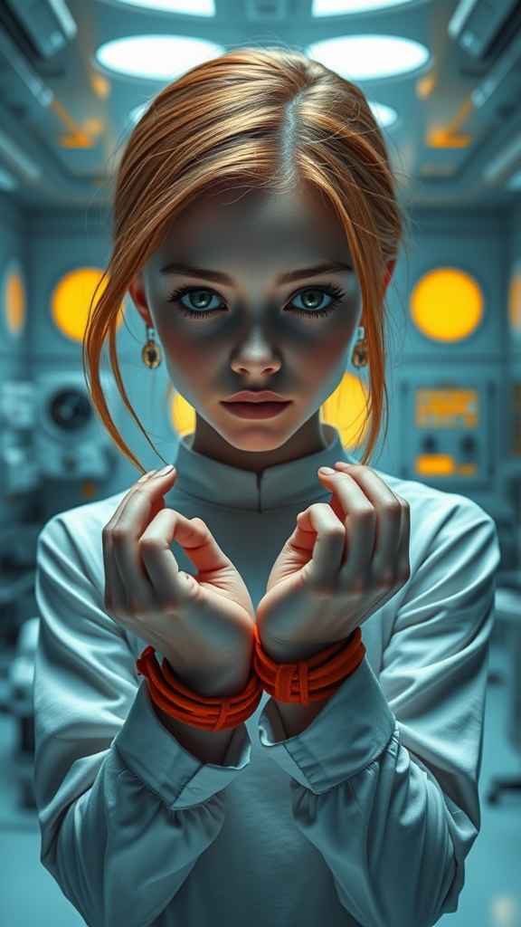 Create a photorealistic, ultra-high resolution 8k portrait of a stunningly beautiful slender girl with a naive and innocent expression, posed ergonomically in a captivating sci-fi setting. Her hands are securely cuffed, and she gazes directly at the camera with intense focus. She stands in front of a futuristic, pristine sci-fi white lab, complete with mustard-colored grids and advanced equipment. The scene is illuminated with dramatic Rembrandt lighting, enhancing the overall ambience. The girl's hair color contrasts strikingly against the clinical backdrop. Avoid any elements that might distort the figure or degrade the quality, such as poor anatomy, excess limbs, or artificial obstructions. Ensure the composition exudes natural light through round windows, solely highlighting the girl's captivating features to achieve a spellbinding and immersive visual.