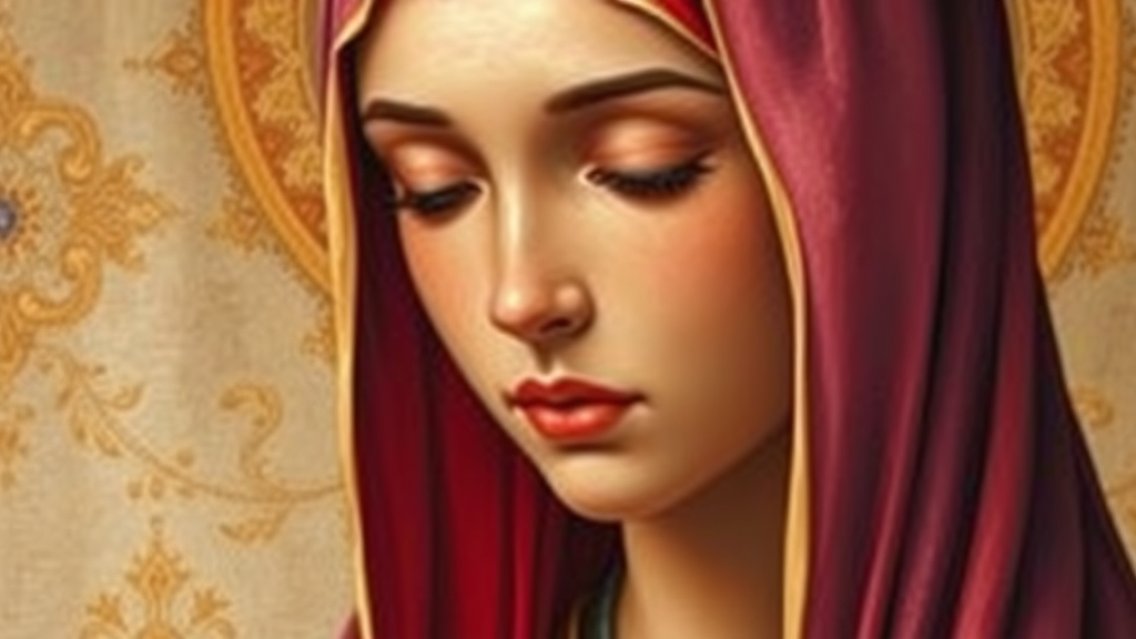 Create a piece inspired by a painting of Mary, utilizing shades of light red and purple with the elegance of a tarot card. Focus on detailed facial features, drawing influence from the works of Haifa Zangana and the artistic heritage of Tonga. Ensure a realistic attention to detail, with subtle creative influences reminiscent of Ann Stookey's style.