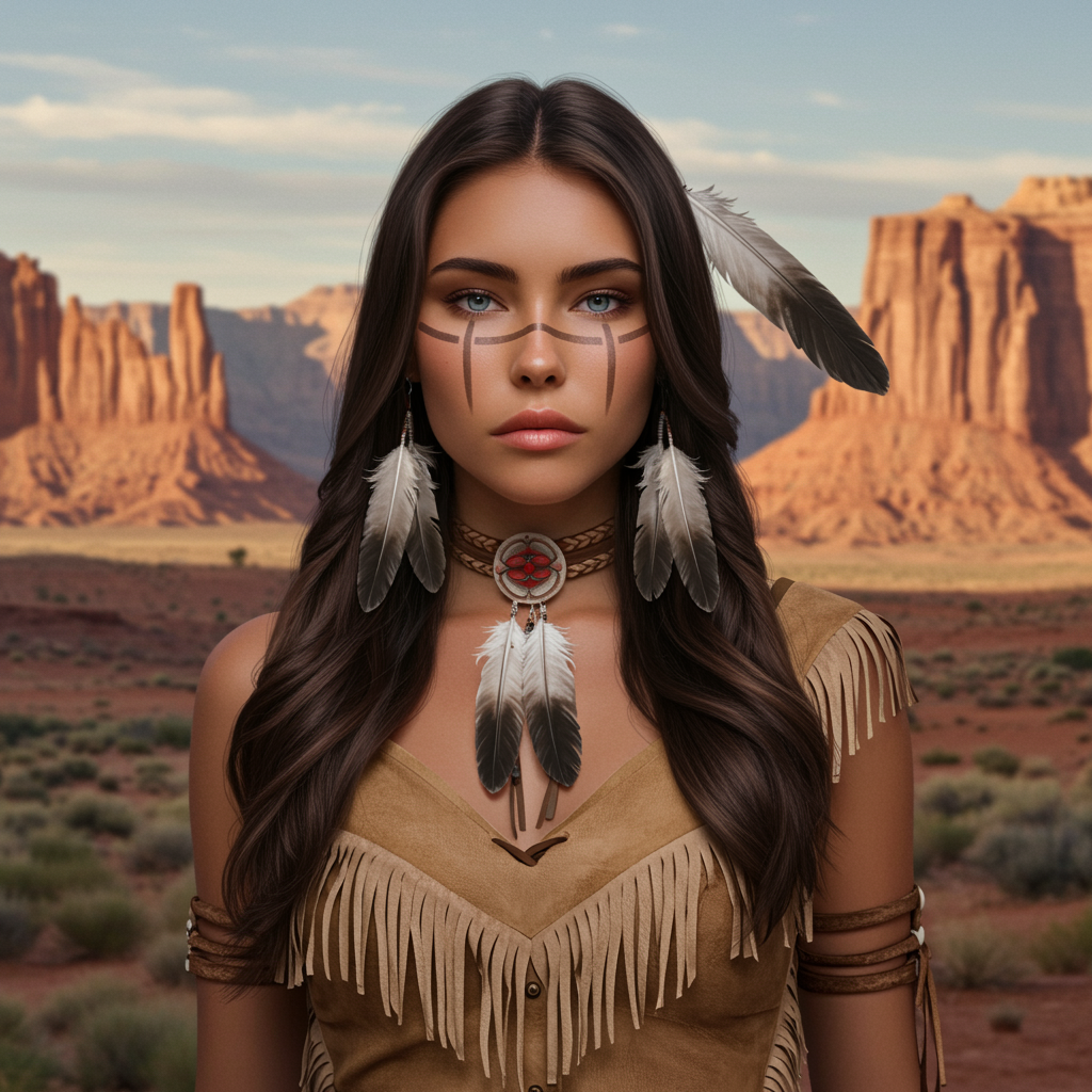 Create a portrait in the style of mdjrny-v4 featuring Madison Beer as a young, beautiful Native American woman inspired by Pocahontas. She possesses a perfectly symmetrical face adorned with intricate feather jewelry. Dressed in a traditional handmade attire, she embodies the spirit of an armed female hunter warrior. Set against the breathtaking Utah landscape, the scene captures ultra-realistic details with a depth of field that emphasizes the elegant concept art. The imagery evokes the artistic essence of masters like Artgerm, Greg Rutkowski, and Alphonse Mucha, rendered in stunning 8k resolution. Make subtle creative modifications while maintaining the core concept, resulting in a unique yet familiar representation.