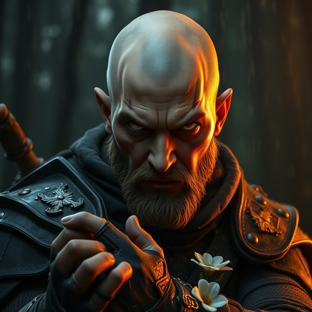 Create a portrait of a young ranger with an intense expression, wearing armor. He is grizzled, bald, and appears angry. The scene is set in a dark, majestic forest environment filled with intricate details. The ranger is in a dynamic, action-oriented pose with realistic hands and a highly detailed face, emphasizing the texture of his skin and pores. Render the scene in full 8k resolution using unity, capturing the mood with very dark lighting, heavy shadows, and a dim, two-tone light that highlights the rain and floating particles around him. Add a subtle touch of elegance with facial markings and flowers. The shot should be reminiscent of renowned artists like Artgerm, Wlop, Ilya Kuvshinov, Greg Rutkowski, and Alphonse Mucha, employing a smooth, sharp focus akin to a digital painting created in Octane Render and reminiscent of art seen on Artstation.