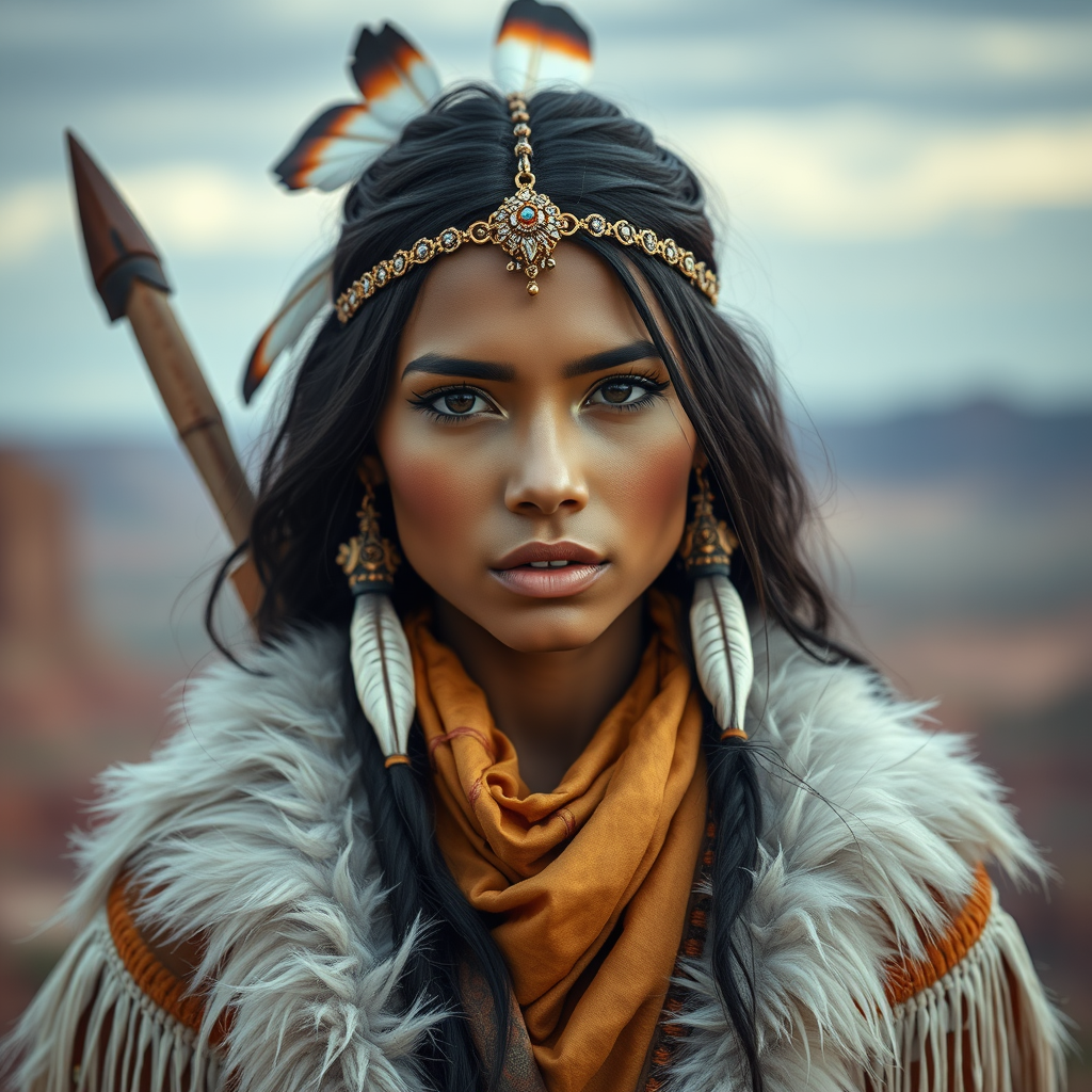 Create a portrait of Madison Beer as a modern interpretation of Pocahontas, capturing a young, beautiful Native American woman with an exquisitely symmetrical face. She is adorned with feather jewelry and dressed in a traditional handmade garment, embodying the essence of an armed female hunter and warrior. Her environment is inspired by the vast, breathtaking landscape of Utah. The image should evoke a sense of ultra-realism and concept artistry, with depth of field and resolution equivalent to 8k. The composition should draw inspiration from the styles of Artgerm, Greg Rutkowski, and Alphonse Mucha, incorporating elements such as a dark complexion combined with accents of white fur and gold fabric. The overall aesthetic remains elegant, maintaining the focus on a singular, compelling figure in harmony with her environment.