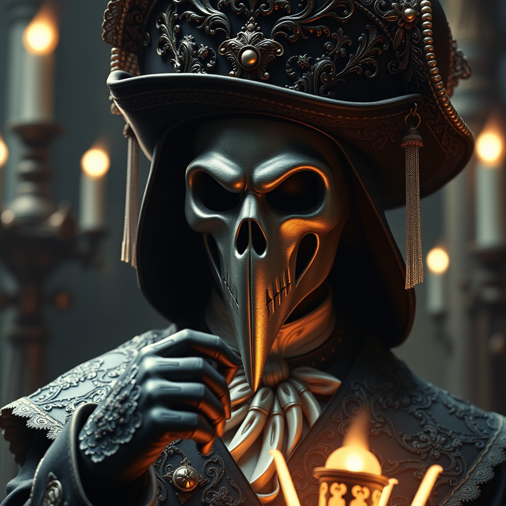 Create a professional photo showcasing a majestic figure in a plague doctor outfit with ornate and high-detail Venetian influences. The photo should have an 8k UHD resolution, embracing an anime and manga style, coupled with digital art techniques including glow effects. The piece should have a hand-drawn appearance, rendered using octane render in Cinema 4D and Blender. Emphasize a dark, atmospheric mood with 4k ultra detail and cinematic depth. The focus should be sharp and hyperrealistic, combining vivid colors with a model shoot style. Inspiration should be drawn from professional majestic oil paintings by Ed Blinkey, Atey Ghailan, Studio Ghibli, highlighted by the works of Jeremy Mann, Greg Manchess, and Antonio Moro. Aim for an intricate, high-detail image that is photorealistic and trending on platforms like ArtStation and CGSociety. Avoid incorporating elements like mutations, extra limbs, poorly drawn features, low resolution, blur, or watermarks. Focus on dynamic composition and cover the entire frame without awkward crops or distortions.