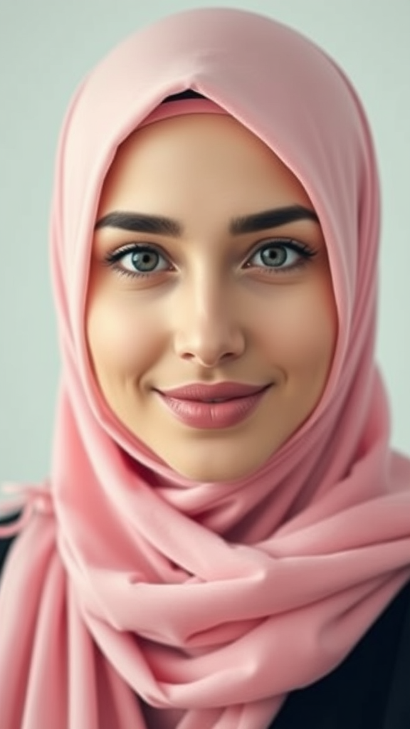 Create a realistic style portrait of a beautiful Turkish Muslim woman wearing a pink hijab, featuring a stunning face with cute pink lips and romantic, captivating eyes. The full head portrait should be unzoomed and presented in 8k quality, with high definition and depth of field. Ensure a clear focus and natural lighting. Make small creative modifications while maintaining the essence of a visually appealing and realistic depiction.