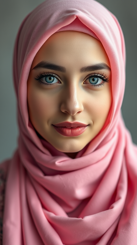Create a realistic style portrait of a beautiful Turkish Muslim woman wearing a pink hijab. Her face is stunning with cute pink lips and captivating, romantic eyes. The image focuses on a full head portrait, showcasing her lovely features in 8k quality, high definition, with depth of field and natural lighting. The portrait should maintain a clear focus and present a natural, elegant appearance.