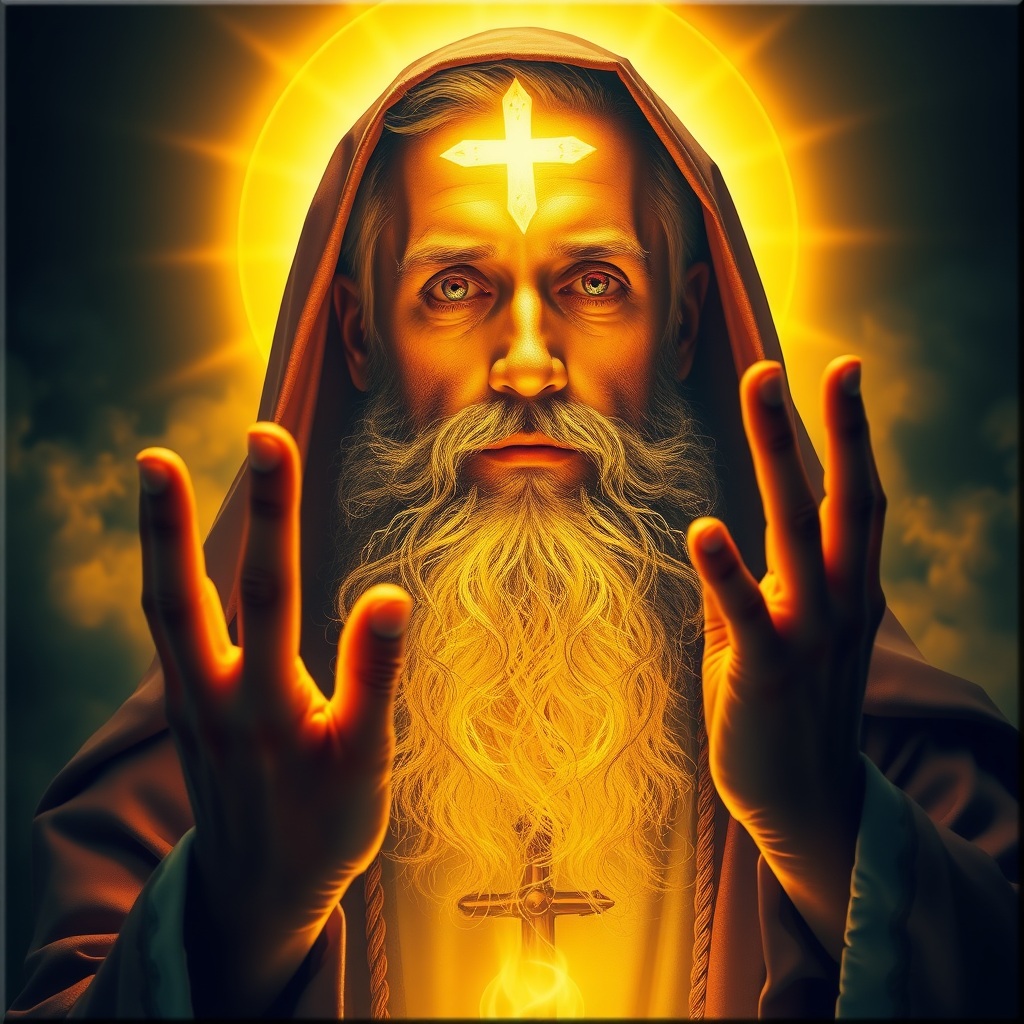 Create a striking full portrait of a sacred priest bathed in holy light, showcasing ultra-quality visuals with intricate details and perfect anatomy. Capture a magical ambiance with a divine, beautiful face highlighted in golden colors. The scene should evoke a sense of spirituality and wonder, with a 3D canvas frame adding depth. Introduce an element of peculiarity with unconventional color schemes and subtle blurriness to create a dreamlike quality. Add surreal features like an occasional extra finger or altered hand to hint at mystical transformation, while ensuring the overall image remains harmonious and awe-inspiring. Avoid any overly exaggerated distortions or disfigurements to maintain the ethereal essence.