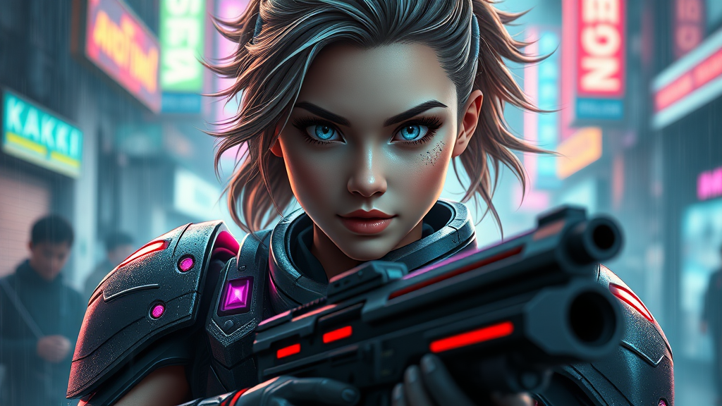 Create a stunning 8k depiction of the world's most beautiful young girl, embodying a goddess in sci-fi medium armor adorned with neon lights. Her white eyes are striking in the urban slow-motion setting, enhanced by neon lights and rain. Capture her full body in a dynamic posture, with a sci-fi laser gun and latex detailing. Her perfectly symmetrical face exudes a confident smile, embodying a cyberpunk spirit ready to engage in battle amidst fog and reflections. The intricate detail and futuristic army uniform evoke a sense of nostalgia and Star Wars aesthetics. Her dynamic hairstyle and photo-realistic detailing showcase detailed skin under lens flares. This stunning piece, trending on ArtStation and CGSociety, is infused with high detail and dramatic artistry, akin to the works of Artgerm, Greg Rutkowski, and Viktoria Gavrilenko. The visual blends cartoon and 3D elements with vivid colors, resulting in a photo-realistic, detailed art rendering that captivates the audience.