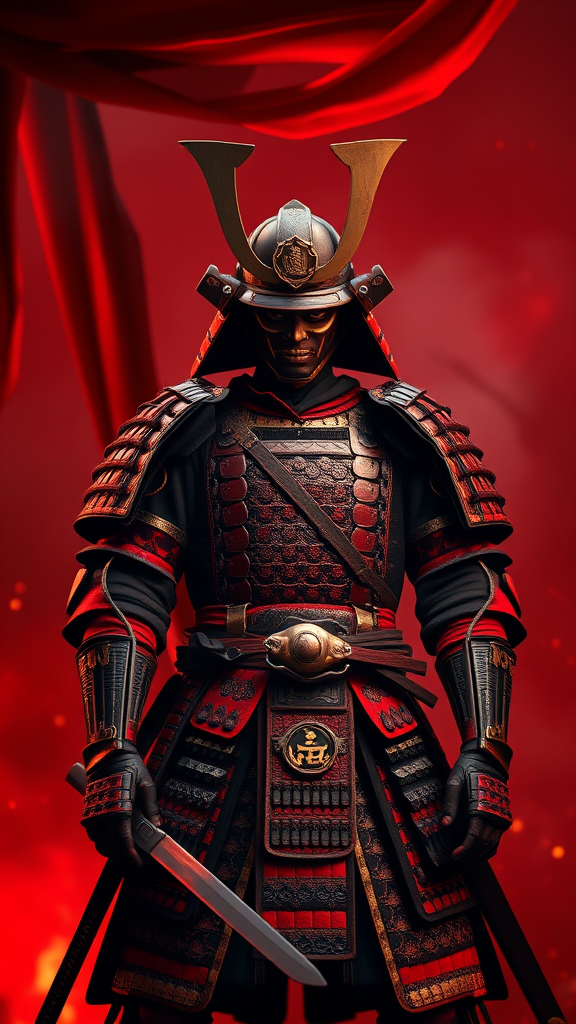 Create a stunning 8k photograph of an ultra-realistic samurai warrior, depicted in full-body shot, showcasing intricate red and black armor. The scene is enhanced with a war flag banner and enveloped in ornate cinematic lighting. The image is high definition, with vibrant illumination that makes it pop, trending on platforms like ArtStation. The hyperrealistic details are captured meticulously, providing an intense focus akin to the Unreal Engine 5 graphics. Set in a dark, red war-torn environment, the atmosphere is alive with smoke, embers, and subtle blur effects, creating a sense of depth of field. The composition is cinematic, maintaining the warrior's centered presence in a 9:16 aspect ratio.