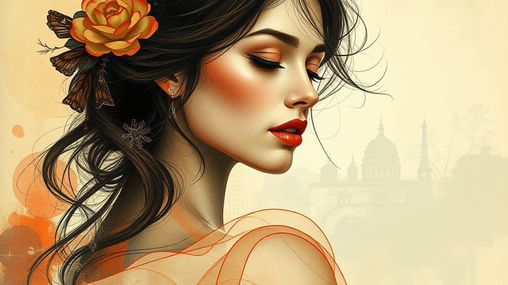 Create a stunning depiction of a woman, influenced by the elegance of video montages and the natural beauty of art nouveau. Employ soft-focus techniques and minimalist sketches to highlight the gracefulness of curves. Utilize free-flowing brushwork to enhance the composition's aesthetic, evoking a sense of wonder and beauty. Incorporate an elongated aspect ratio to accentuate the artwork's intriguing structure. Allow creative freedom to personalize and stylize the piece, while maintaining the foundational inspiration and concept.