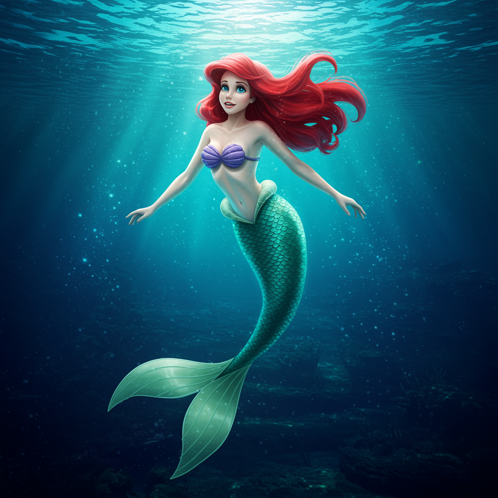 Create a stunning, high-resolution artwork inspired by the classic Disney character Ariel from The Little Mermaid, depicted as a vibrant 17-year-old. Capture her in a graceful, alluring pose, fully underwater with a mesmerizing sea background. The image should showcase exquisite detail and clarity, reminiscent of a 16k, UHD, HDR masterpiece. Ensure the focus is on the natural beauty and wonder of the character and setting, avoiding any distortions or low-quality elements such as mutations, clones, or extra body parts. Keep it clean and free from any distractions like watermarks, logos, or unnecessary text, and aim for a seamless, cohesive portrayal that maintains the enchantment of the scene.