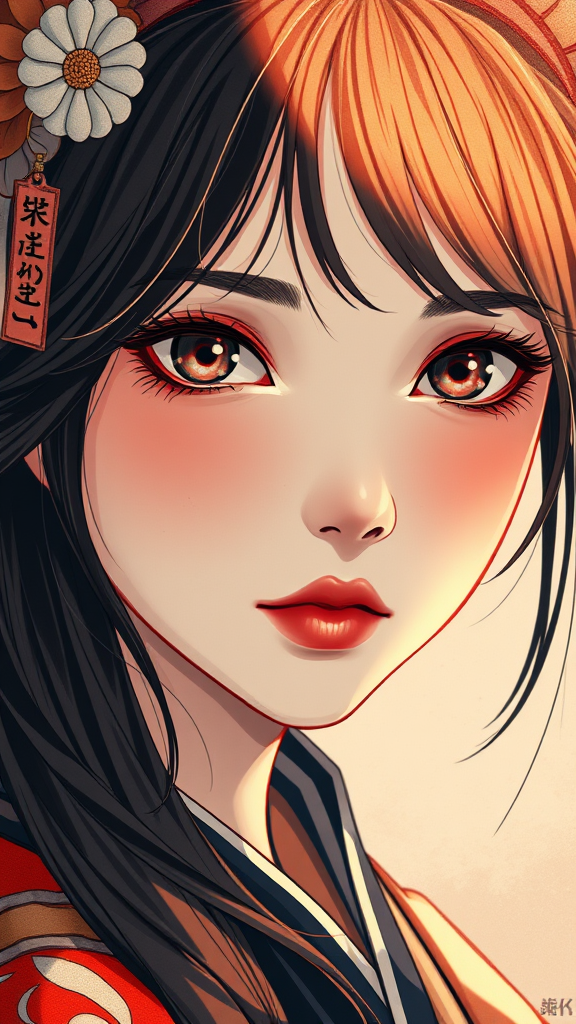 Create a stunning illustration in the style of Ukiyo-e, focusing on a single girl with captivating, beautiful eyes. The composition should feature dramatic lighting to enhance the details, aiming for masterpiece quality. The image should be rendered in ultra-high definition, capturing every nuance in HDR and 8K. Ensure the subject is presented with elegance and grace, avoiding any imperfections such as disfiguration, mutations, or unnatural features. Keep the image clear and in frame, avoiding any issues like blurriness, low resolution, or distractions such as watermarks, logos, or text.
