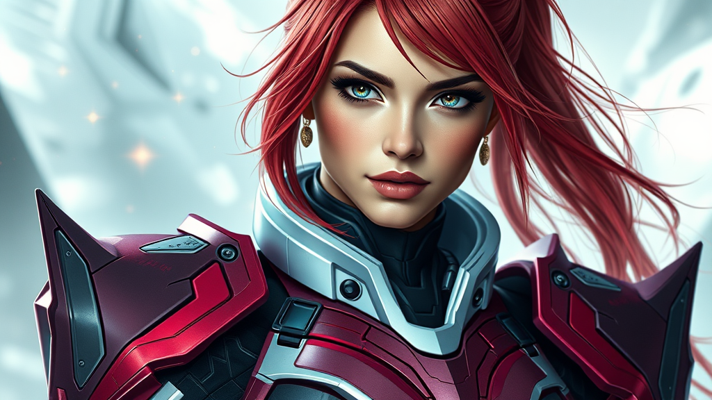 Create a stunning photorealistic portrait of the beautiful Asuka Langley, showcasing her wearing sleek and intricate sci-fi armor. The armor should feature futuristic details and a vibrant color palette, enhancing her striking features and adding a sense of elegance and power to her presence. The composition should capture her confident and determined expression, set against a dynamic backdrop that complements the futuristic theme.