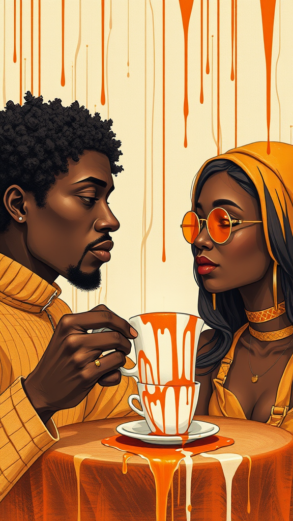 Create a surreal illustration featuring a dark amber and white color palette, using the paint dripping technique to depict an afrofuturistic theme. Integrate realistic portraitures with elements of pop colorism, capturing the essence of enjoying a cup of coffee in an imaginative setting. The composition should be elongated, emphasizing an 8:11 aspect ratio, with a touch of creative transformation to bring the scene to life.