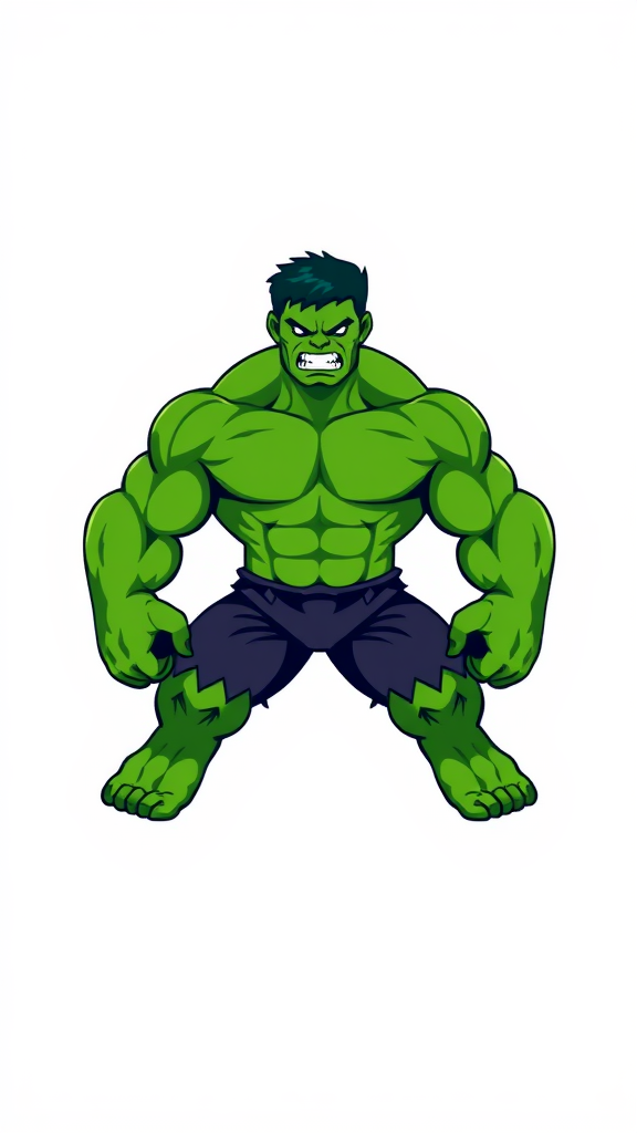 Create a symmetrical illustration of the Hulk, using flat icon design principles, incorporating dynamic angles and vibrant shades of green, while maintaining the core concept of strength and power.