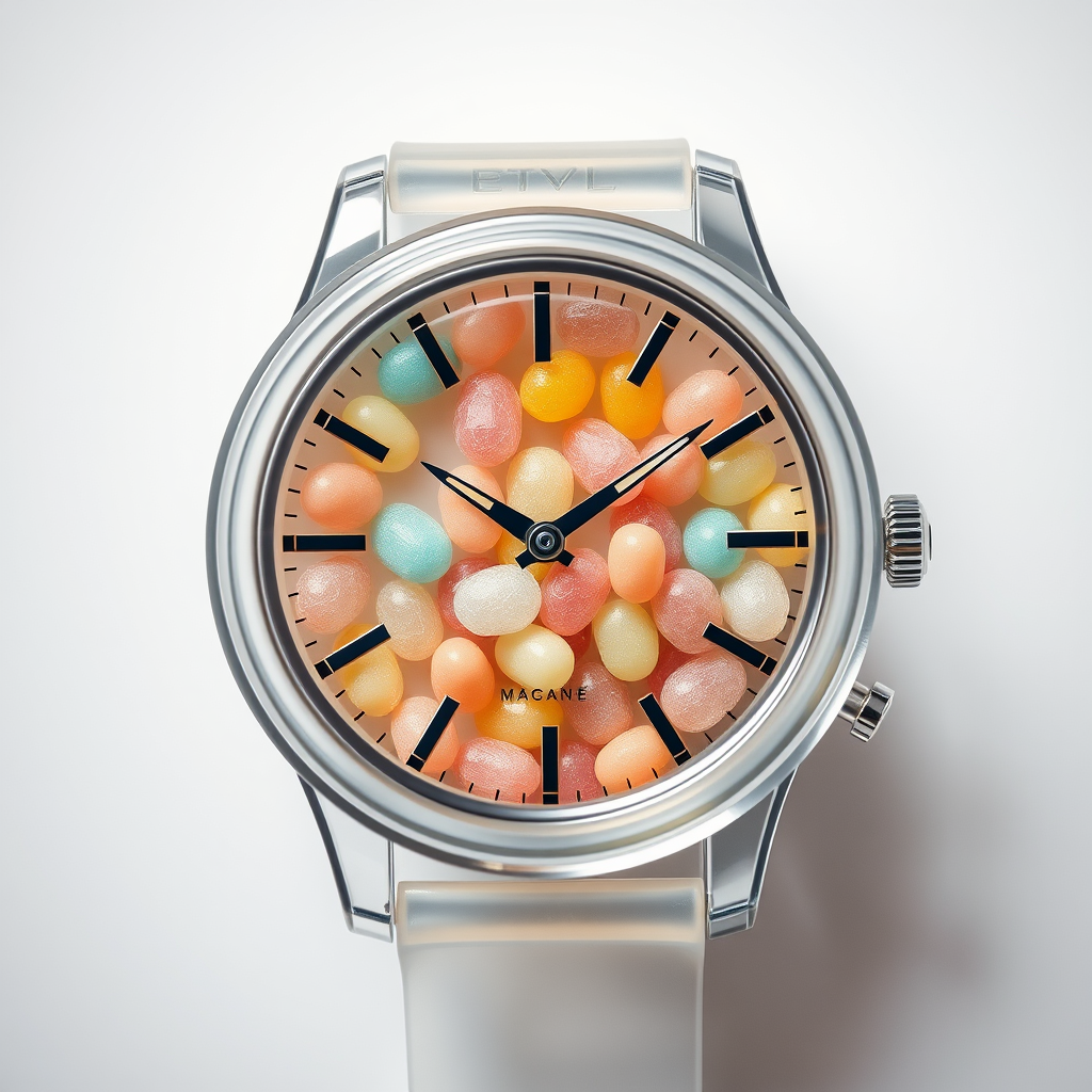 Create a top-down cinematic fine art image of a professional studio photoshoot, featuring a sophisticated watch crafted from transparent vinyl and translucent glass. The interior is filled with colorful, small jelly beans, showcasing a high refractive index. The design incorporates frosted glass elements with pastel hues, highlighted by a subtle pale yellow accent. The style is inspired by Dieter Rams, with an emphasis on clean, minimalist lines and harmonious color balance.
