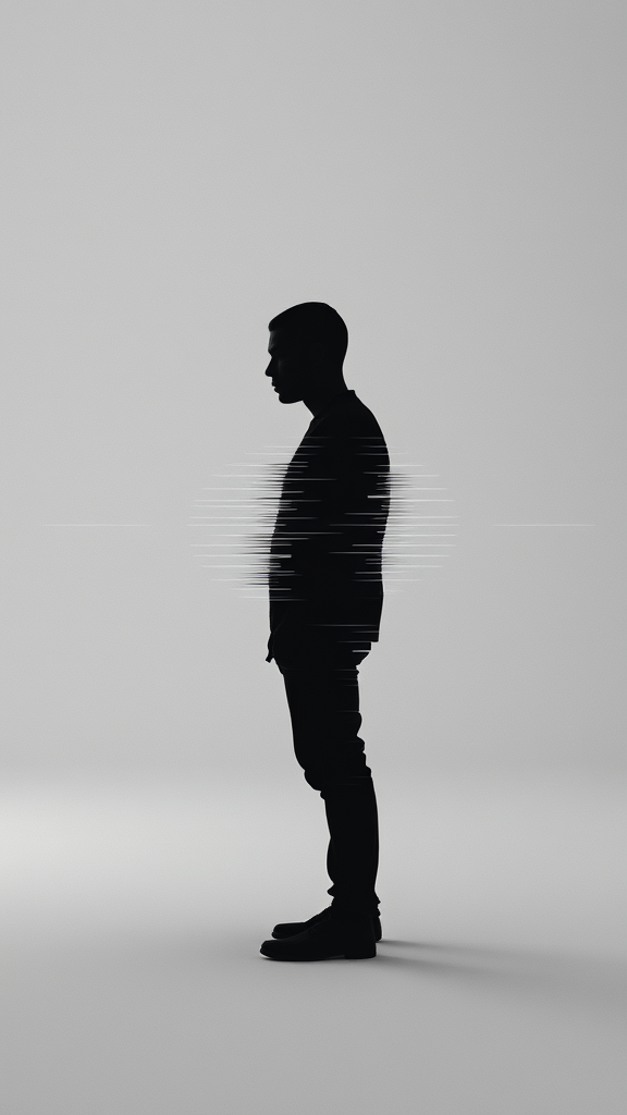 Create a vertical portrait of a solitary human silhouette infused with glitch art elements like linear distortion and digital interference. The figure is horizontally distorted, featuring scan line interference patterns against a minimalistic grey background. The lighting is softly diffused, enhancing a corrupted data aesthetic with noise textures and visible horizontal artifacts. The overall composition embraces a raw style, with subtle creative modifications to maintain the essence of digital entropy and artistic chaos.
