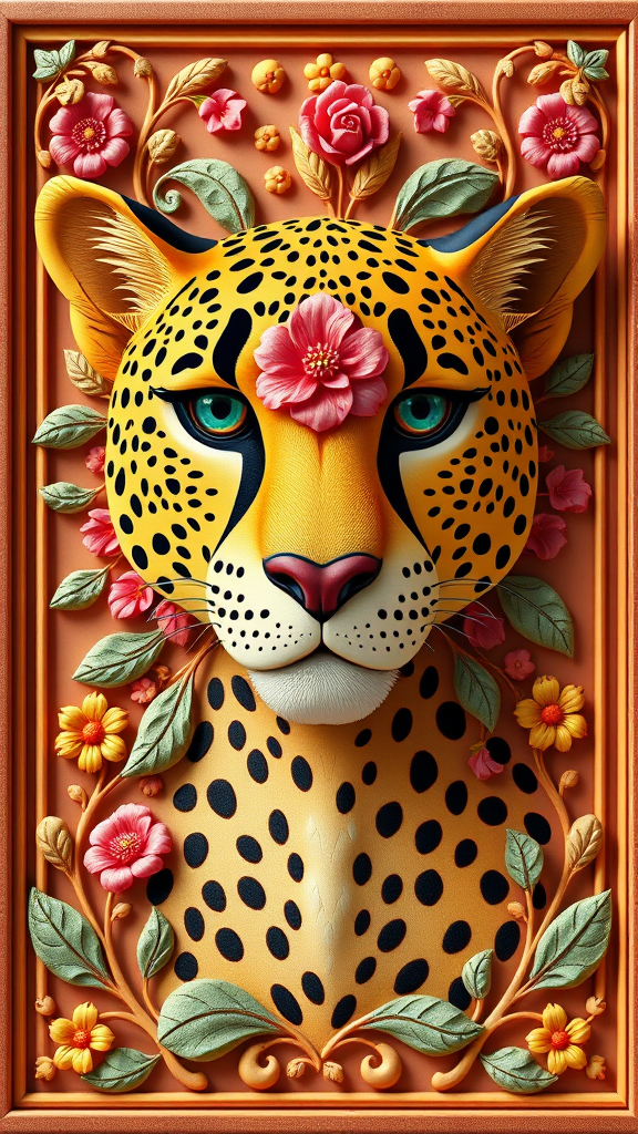 Create a vibrant and intricate 3D render of a cheetah with classical floral elements radiating from the center of its face, designed as a woodcutting template. The style should blend elements reminiscent of Pixar and Disney’s animation aesthetics, featuring a cartoonish yet elegant approach. The design is detailed in 8k resolution, set within a beautiful canvas frame, showcasing a harmonious combination of vivid and unusual colors. The composition should avoid elements like extra limbs, disfigured features, or blurry sections to maintain high-quality artistry. Render the cheetah’s features with precision, ensuring correct anatomy and proportions, and integrate the floral motifs seamlessly to enhance the overall visual appeal. While being inspired by video game art, ensure that the piece is polished, avoiding any poorly drawn aspects, to achieve a stunning and cohesive artwork.