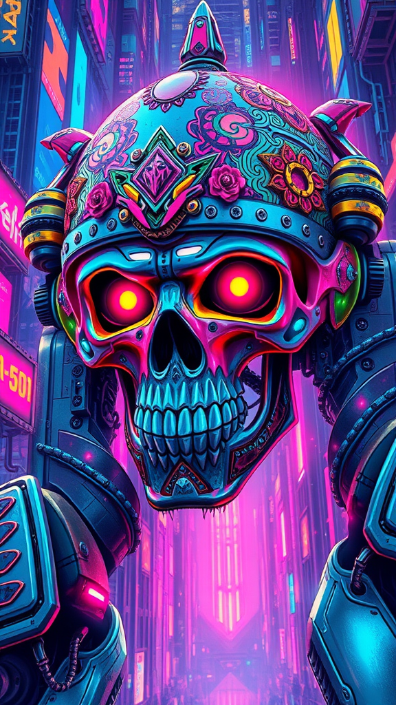 Create a vibrant digital illustration of a cyberpunk skull adorned with intricate armor, featuring maximalist detailing and a kaleidoscope of colors. The skull's design should blend futuristic elements with elaborate, ornate patterns, capturing the essence of a dystopian world. The composition should embrace a sense of chaos and urgency, with the skull's eyes glowing intensely amidst a bright, neon-lit environment. Let the armor shimmer with metallic hues, reflecting the vibrant, bustling atmosphere of a sprawling cybernetic metropolis. The tall, vertical aspect ratio highlights the towering presence of this formidable figure in a world that is both dangerous and mesmerizing.