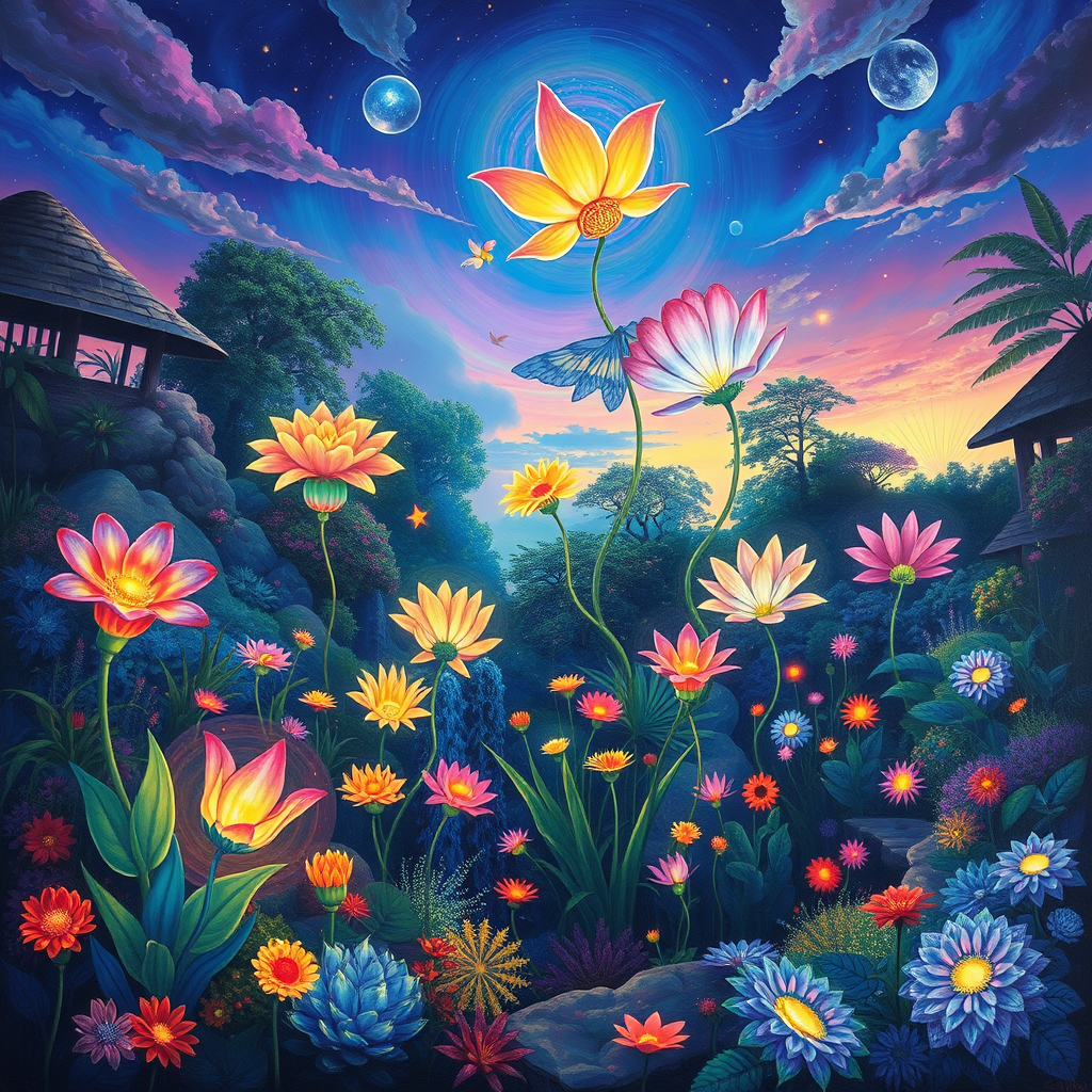 "Create a vibrant painting depicting a fantastical garden where gravity doesn’t apply and colorful plants float serenely in mid-air, their luminescent petals glowing under a mystical twilight sky."