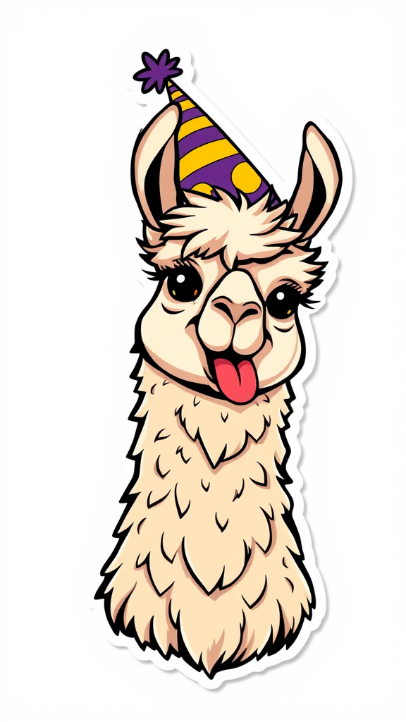 Create a vibrant sticker design of a cute llama with a mischievous expression, wearing a quirky party hat. The llama is depicted playfully, sticking out its tongue, exuding fun and cheerfulness. Use dynamic lines and bright, lively colors to capture its spirited nature, setting it against a clean, white background.