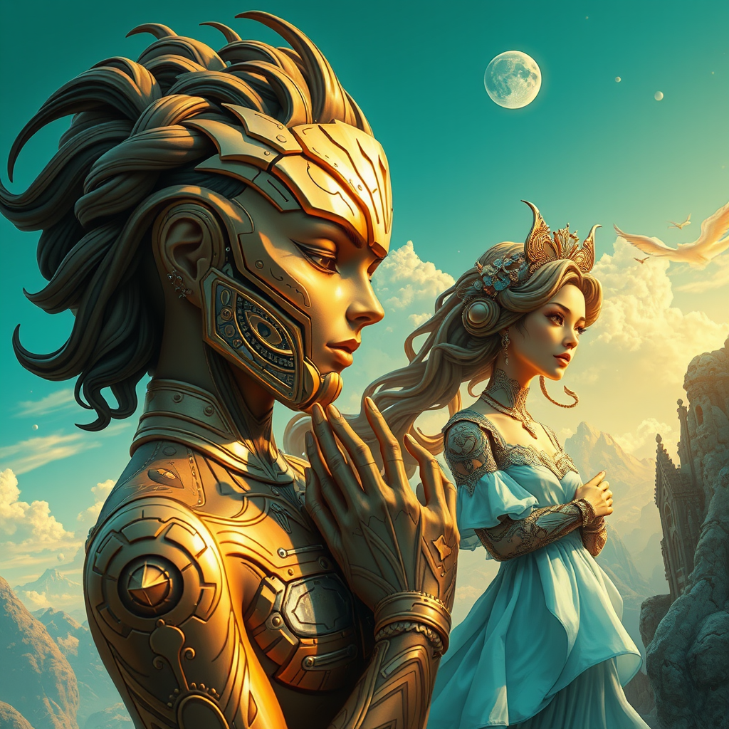 Create a visually captivating narrative with influences from Christiano V and the intricate style of Franciszek Starowieyski. Incorporate a palette of gold and cyan to enhance a hyper-realistic sci-fi setting. Develop romantic illustrations infused with the flowing forms of organic sculpting. Infuse the dynamic creativity of Android Jones to craft a romantic fantasy world populated by detailed characters and surreal landscapes. Envision the scene in a striking 32:31 aspect ratio, maintaining a vivid saturation and version 5.2 inspiration, subtly adapting concepts to create a unique yet familiar vision.