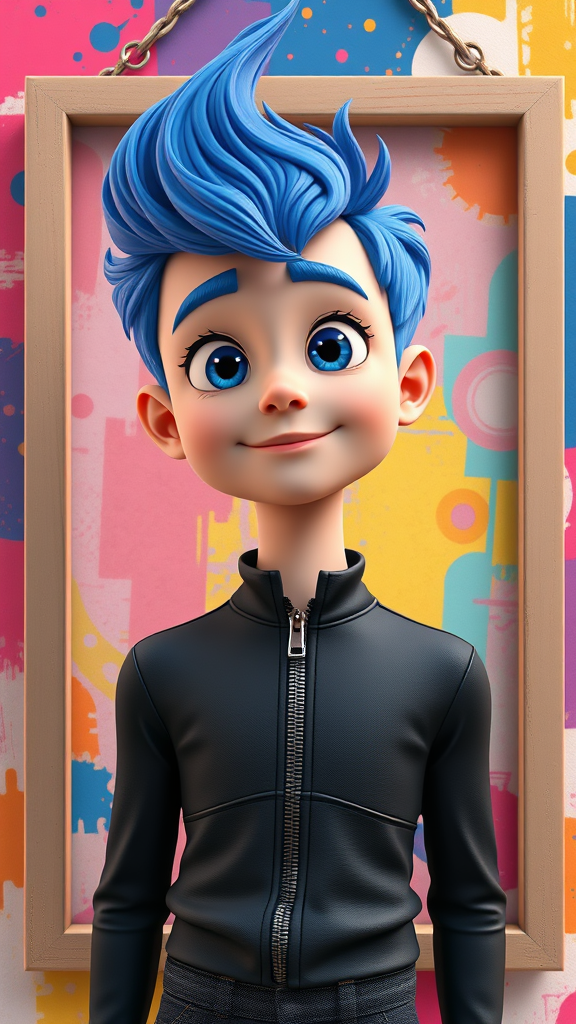 Create a vivid and imaginative 3D render capturing a blue-haired boy in a sleek black zipper top, inspired by a fusion of Pixar and Disney styles. The scene showcases a whimsical blend of unusual colors and an intriguing abstract background. The character is placed within a beautifully detailed canvas frame, adding a touch of artistic flair. Keep the elements playful and cartoonish, emphasizing a stylized and slightly surreal look. The composition should maintain visual harmony and balance, with creative proportions and imaginative design, while retaining a polished and professional finish at 8k resolution.