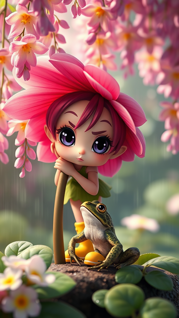 Create a whimsical, adorable 3D character design featuring an extremely cute chibi flower fairy peeking from behind a vibrant flower in the rain, nervously eyeing a nearby toad. The setting is a stunning scene rich with cascading wisteria flowers, capturing the essence of springtime. This fairy wears charming yellow rain boots and has large, expressive eyes. The atmosphere is filled with cinematic lighting and intricate details, creating a hypermaximalist, award-winning visual feast. The scene is rendered with Octane for a visually striking effect.