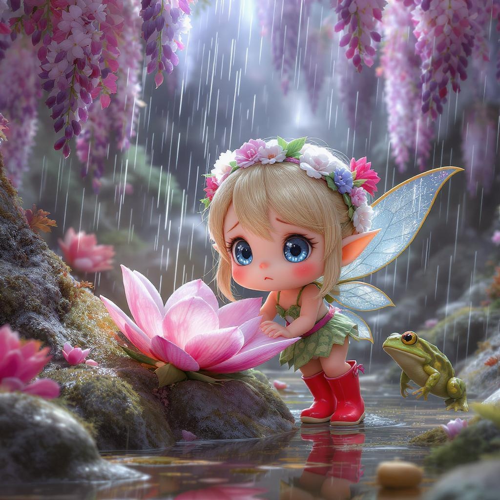 Create a whimsical and adorable 3D character design inspired by a chibi, extremely cute little flower fairy. Picture her hiding nervously behind a blossom in the pouring rain, startled by a curious toad. The scene is set in a breathtaking landscape filled with cascading wisteria flowers, embodying the essence of springtime. She's wearing charming red rain boots, and her large, expressive eyes add an enchanting quality. The render should capture the award-winning detail and hypermaximalist style, enhanced by cinematic lighting with Octane render.