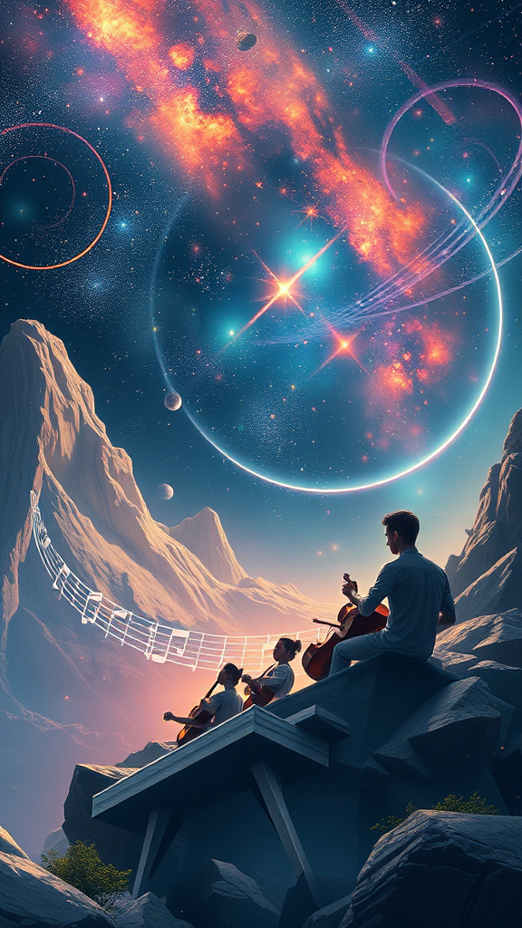 Create a world where music is the universal language that holds magical powers, capable of healing, transforming landscapes, and connecting beings across galaxies, all governed by the harmony of celestial melodies.