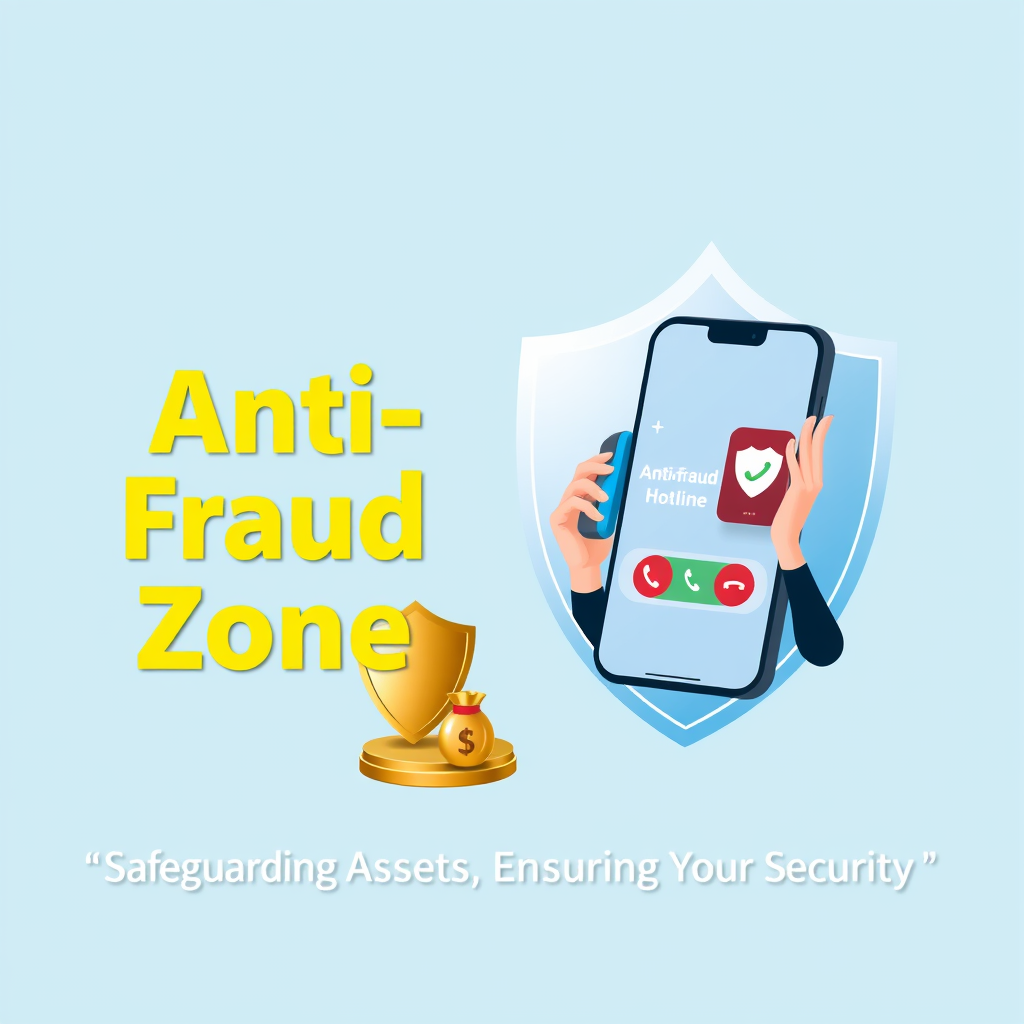 Create an anti-fraud awareness banner with a light blue background symbolizing trust, incorporating a transparent shield to represent security. On the left side, depict a character engaged in a phone conversation, holding their hand up as a representation of a phone screen. The screen should display the anti-fraud hotline +165, alongside a shield icon and a call button. Adjacent to the character, include elements such as a golden shield, a money bag, and a padlock to emphasize protection and security. Feature a prominent title on the left stating "Anti-Fraud Zone," with a smaller subtitle below that reads "Safeguarding Assets, Ensuring Your Security." Add subtle creative touches to enhance the overall design while staying true to the original idea.