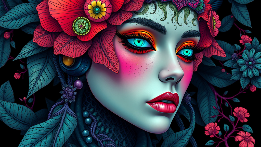 Create an artwork inspired by the fusion of Ernst Haeckel's intricate natural forms, Maria Sibylla Merian's botanical illustrations, and the bold, vibrant styles of Tristan Eaton, Victo Ngai, and Ross Draws. Meld this with the futuristic, sleek aesthetics of Hajime Sorayama and the detailed linework of Greg Tocchini and Virgil Finlay. Emphasize sci-fi elements using vivid colors and neon lights, reminiscent of digital paintings found on platforms like Pixiv. Capture the crisp clarity of Ilya Kuvshinov’s portraits in an 8k, UHD, HDR setting. The artwork should present a visually striking composition without any emphasis on disfigurement, mutations, or cloning effects. Ensure a polished, cohesive image that avoids low resolution aspects, blurring, and any distractions like watermarks, logos, or text elements. Maintain a focus on a single, well-composed scene without unnecessary duplication or division into split images.