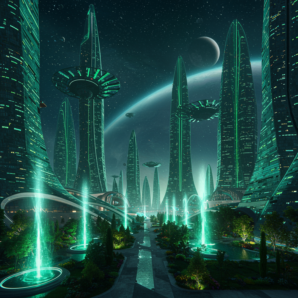 Create an awe-inspiring digital image of a futuristic cityscape that highlights the advanced design and cutting-edge technology of an alien civilization. This city should be composed of towering buildings, each uniquely shaped and adorned with shimmering facades made from innovative, otherworldly materials. Dynamic lighting, with vivid hues of emerald green and deep indigo, should electrify the cityscape. Holographic streams and floating fountains emerge among lush gardens and avant-garde sculptures. The background features a smooth expanse of space, where stars and distant galaxies create a stunning contrast to the organic beauty of the city. The atmosphere should be epic, exciting, with a celestial touch, featuring soft, ambient lighting that employs HDRI for optimal realism. The image should deliver the highest level of professionalism, designed using industry-leading equipment such as 35mm, Zeiss, Hasselblad, Fujifilm, Arriflex, IMAX, and presented in resolutions up to 8k. Expect hyper-realistic renderings including lens flares, resembling a matte painting or concept art with a delicate, detailed focus on architectural elements. The artwork should meet the quality standards of CGSociety and Octane Render, achieving a supreme level of detail that is inspiring, and worthy of being featured in a premium magazine or as a high-quality wallpaper.