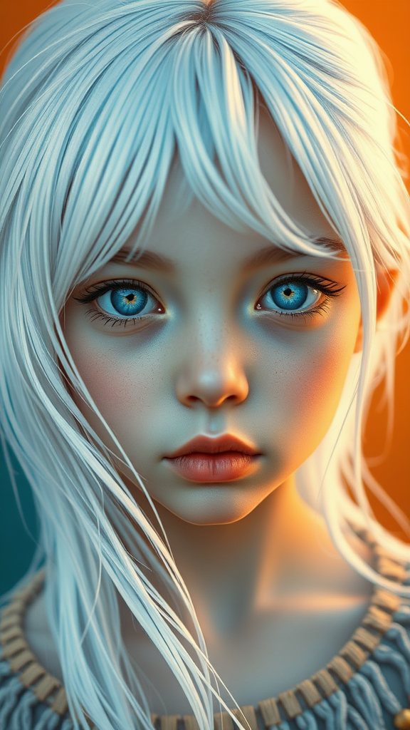 Create an enchanting image of a young girl with striking white hair, set against a harmonious palette of light teal and deep orange. Her serene expression and luminous eyes are reminiscent of the art style characteristic of Ross Tran, infused with the muralistic depth and texture akin to Guido van Helten. Capture her in a series of close-up shots, mingling the detailed vibrancy of comic art with the serene fluidity found in marine paintings. Add a touch of dynamic charm through subtle animated elements inspired by animated gifs, bringing the piece to life with graceful motion.