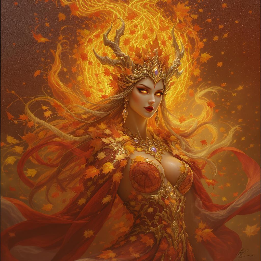 Create an ethereal autumn leaves deity with a focus on intricate details and epic beauty. Imagine them surrounded by a blazing, ethereal fire that casts dynamic, volumetric lighting across their features, akin to a high-quality 3D rendered masterpiece. The scene captures the essence of an oil painting on canvas, inspired by Greg Rutkowski's style, showcasing hyperdetailed elements and a rich, detailed background as befitting of a DnD character portrait. The character should embody a blend of traditional and fantastical elements, exuding a sense of majesty against a stunning autumnal backdrop, akin to those found on ArtStation character portraits.