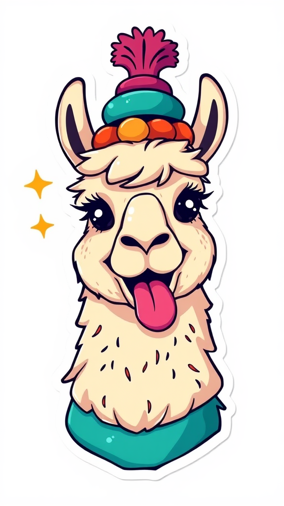 Create an illustration of an adorable llama exuding playfulness and joy, featuring a mischievous grin and a cheeky expression. Envision the llama wearing a quirky, colorful hat and playfully sticking out its tongue. Use bold, vibrant colors and dynamic lines to capture its lively spirit. The design, intended as a sticker graphic, should have a crisp vector style with clean contours against a white background. Add charming details, like sparkling eyes or a whimsical scarf, to enhance its delightful personality while keeping the essence of fun and cheerfulness intact.