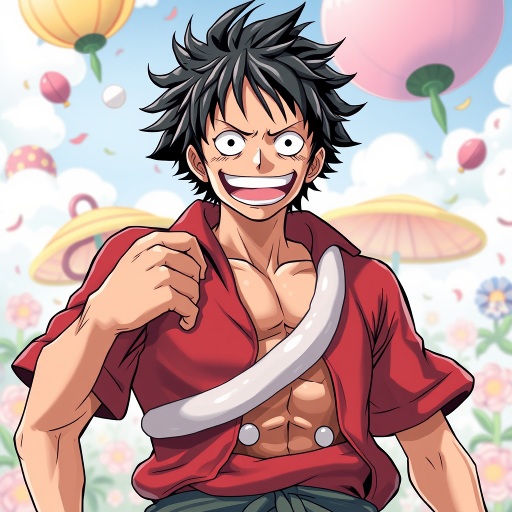 Create an illustration of Luffy from One Piece, highlighting his extraordinary elasticity in a humorous and unique manner. Set against a whimsical and lively backdrop, the artwork should capture Luffy's Gear 5 transformation as the legendary God Nika, showcasing his pristine white form. Focus on exaggerating his rubbery features for comedic effect, employing advanced rendering techniques. Allow for minor creative adjustments while maintaining the essence of the concept.