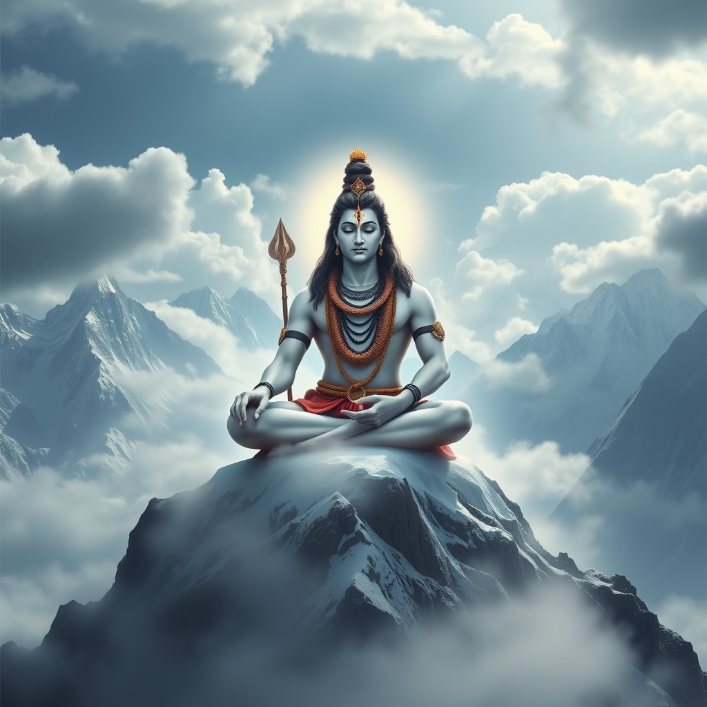 Create an image depicting Lord Shiva, the revered Hindu deity, seated in profound meditation atop a majestic mountain. His presence exudes timeless power and serenity, with an ethereal glow illuminating his divine form. Surround him with cascading clouds and towering snow-covered peaks, enhancing the serene yet commanding atmosphere. Highlight the sacred snake coiled around his neck, symbolizing his mastery over fear and his cosmic responsibilities. The scene should embody the balance of tranquility and immense strength, resonating with the awe-inspiring reverence Shiva commands as the supreme ruler of this sacred realm, poised above the world in serene contemplation.