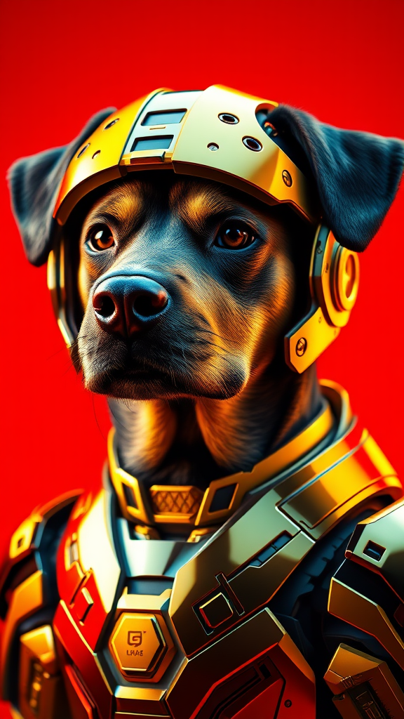 Create an image of a dog's portrait in an alert pose, set in a cyberpunk style. The dog is wearing a bionic helmet and Iron Man-inspired armor, featuring high detail and an octane render. The design should emphasize "very dog" characteristics, with golden armor and chrome plating. A bright red and yellow backdrop provides contrasting lighting. The focus is on ultra-realistic detail, achieving an 8k photorealistic quality. Avoid elements such as poor anatomy, blurriness, extra limbs, or any distortions. Ensure clear, defined features without text, logos, watermarks, or any unrealistic or inaccurate elements, maintaining good composition without distractions.