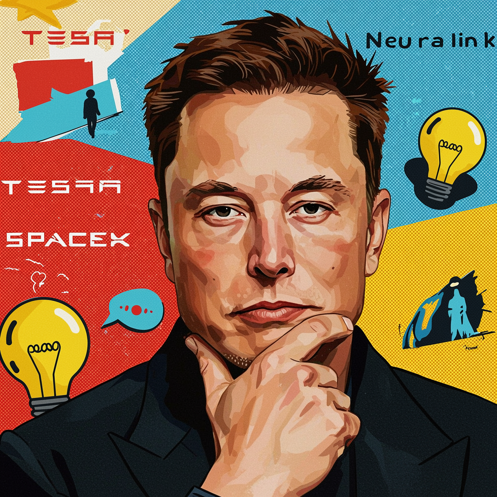 Create an image of Elon Musk deep in thought, depicted in a Neo-Pop Art style. Capture his intense facial expression as he contemplates groundbreaking ideas, surrounded by symbols representing his ventures like Tesla, SpaceX, Neuralink, and the Boring Company. Use a bright and saturated color palette with vivid shades of red, blue, yellow, and green, paired with bold black outlines, reflecting the Neo-Pop Art aesthetic. Incorporate elements of collage by blending photographs, text, and graphic designs to create a dynamic and visually striking composition that embodies the innovative energy of Elon Musk's entrepreneurial spirit. Emphasize his central role, with various symbols and elements radiating outward from his concentrated expression. Add subtle creative variations to enhance the overall impact while maintaining the essence of the concept.