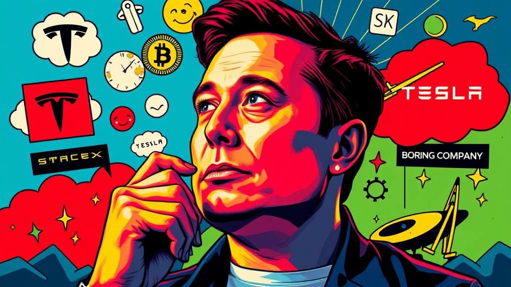 Create an image of Elon Musk deep in thought, rendered in a Neo-Pop Art style. Capture his contemplative expression as he envisions groundbreaking ideas, surrounded by symbols of his ventures like Tesla, SpaceX, Neuralink, and the Boring Company. Employ a vibrant color palette with intense shades of red, blue, yellow, and green, accentuated with bold black outlines, evocative of Neo-Pop Art. Incorporate collage elements, blending photographs, text, and graphic designs to craft a visually striking composition that mirrors the dynamic energy of Musk's entrepreneurship. Position Elon at the center, with symbols and elements radiating outward from his thoughtful demeanor, underscoring his central impact in the scene.