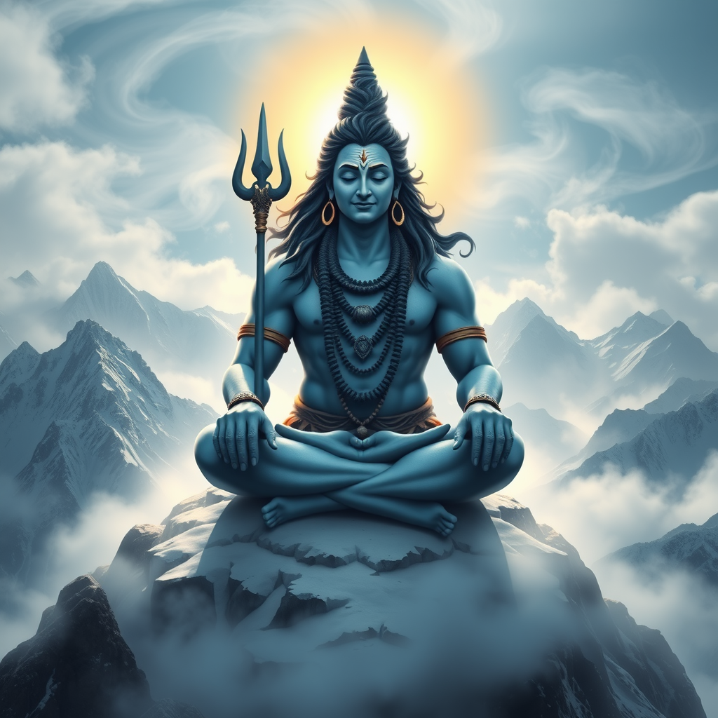 Create an image of Lord Shiva, the Hindu deity, seated in deep meditation atop a majestic mountain peak. Show him with an awe-inspiring presence, radiating divine energy and power. Surround him with a backdrop of swirling mist and snow-draped peaks, emphasizing the serene yet commanding aura of the scene. Capture the essence of Shiva's cosmic control, depicting him with closed eyes, a gentle smile, and a tranquil demeanor. Include the iconic serpent coiled around his neck and add subtle golden light emanating from his form, evoking reverence and wonder. Portray Shiva as the supreme ruler of this sacred mountain realm, encapsulating both serenity and strength.