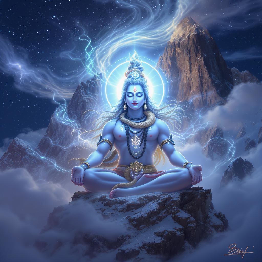 Create an image of the Hindu deity Shiva, seated in deep meditation atop a majestic mountain, exuding an aura of divine power. His presence is both serene and formidable, enveloped in a luminescent glow that reflects his cosmic authority. He is surrounded by ethereal clouds and towering, snow-clad peaks, creating a harmonious balance between tranquility and strength. A coiled snake rests around his neck, symbolizing his control over primal forces. The scene should evoke reverence and awe, capturing Shiva’s supreme command over this sacred mountain realm.
