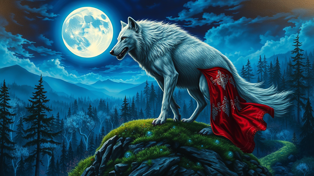 Create an oil painting with intricate details capturing a landscape set under a vivid blue full moon. The scene offers a panoramic view of a menacing yet majestic muscular white werewolf in full battle stance. This hyperrealistic creature, with grey skin and wearing red garments adorned with intricate silver filigree, stands poised atop a verdant hill, gazing across an enchanted forest. This magical woodland is alive with bioluminescent trees and luminescent flora, creating a mystical ambiance. The artwork boasts UHD, HDR, 8K quality for striking clarity and depth. Emphasize the enchantment and strength within the scene while maintaining the essence of mystery and intrigue.