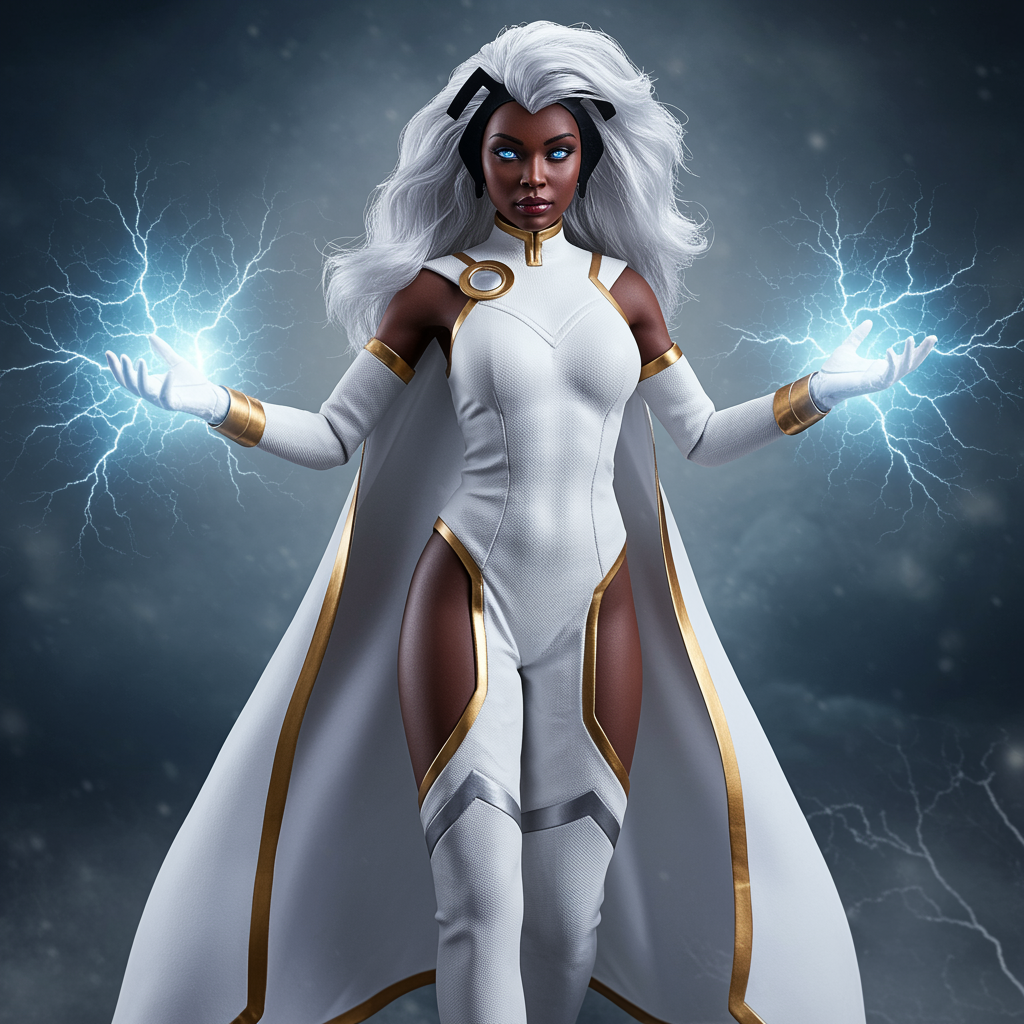 Create an ultra-detailed masterpiece in the extreme vivid fantasy realism style, depicting Storm from Marvel Inc. in hyper-realistic fantasy digital photography. Capture her meticulously with precision and care, ensuring she is centered in a perfect composition. Utilize overexposed photography to produce a striking and ethereal atmosphere, with sharp focus emphasizing exquisite details. Highlight her iconic white attire with clear and bright elements. Her expressive eyes should convey both power and compassion. Showcase her in a dynamic pose with a flowing cape, blending realism with fantasy seamlessly. Celebrate her essence of weather control and command within a visually stunning, imaginative setting, adding subtle creative modifications to enhance the core concept.