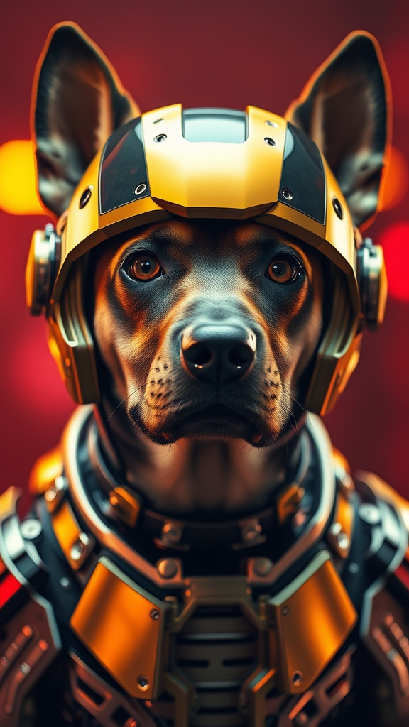Create an ultra-realistic 8k image of a dog in a cyberpunk style, featuring a bionic helmet and Iron Man-inspired armor with golden hues and chrome plating. Capture the dog in an alert pose, with high detail and octane render for a vivid and dramatic effect. The background should contrast with bright red and yellow lighting to emphasize the dog's features. Aim for precision in depicting the dog's expression and bionic enhancements while maintaining photorealistic quality. Avoid any distortion, unnecessary elements, or art errors such as poorly drawn features, extra limbs, or disfigured anatomy. Keep the image sharp and clear to highlight the dog's distinct character and futuristic armor.
