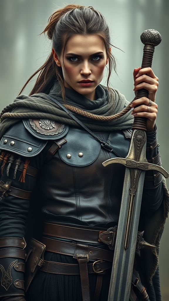Create an ultra-realistic image of a medieval warrior woman wearing leather armor embellished with intricate metallic details and a tattered cloak. She is adorned with multiple straps and ornaments and holds a long sword with an elaborate hilt. The background is shrouded in a misty atmosphere, enhancing a sense of mystique and epic adventure. Her expression is intensely focused, adding an aura of enigma and readiness for an impending challenge.