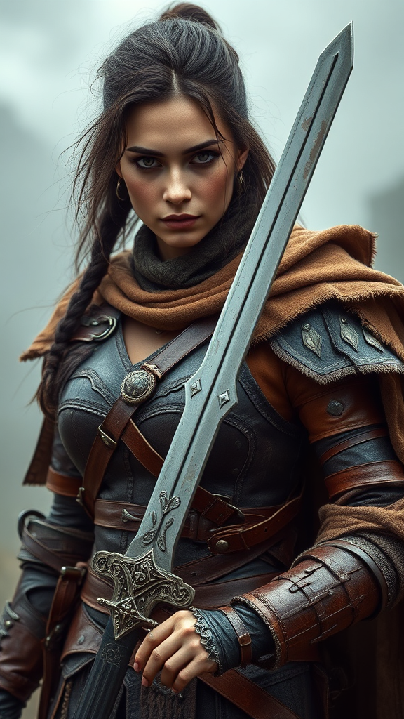 Create an ultra-realistic image of a medieval warrior woman clad in leather armor with intricate metal detailing and a tattered cloak. Her ensemble is adorned with an array of straps and embellishments. She wields a long sword with an elaborately designed hilt. The background is shrouded in mist, imparting a mystical and epic atmosphere. Her expression is intensely focused, instilling a sense of enigma and readiness for an impending challenge.