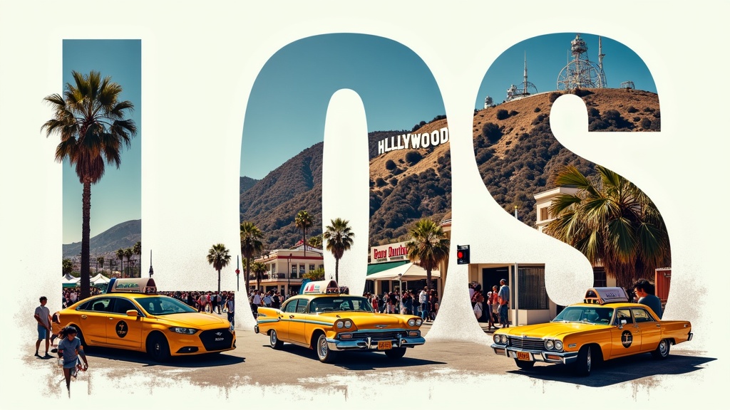 Create a vertical collage capturing the essence of Los Angeles, each letter from 'L' to 'S' showcasing a dynamic scene. The Santa Monica Pier and Hollywood Sign dominate the background, framed by smaller scenes of vibrant street life, iconic yellow cabs, and active people. The atmosphere is energetic and lively, highlighting the city's vibrant spirit. Bold, eye-catching typography enhances the collage, offering a stunning visual representation of Los Angeles, reminiscent of a high-contrast cinematic photo-style. Avoid elements like low quality, watermarks, poor anatomy, or unrealistic imagery to ensure a clear, engaging portrayal of the city.