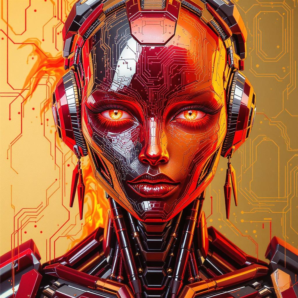View this AI-generated image featuring create a highly detailed and intricately designed female robot character with fiery colors focus on a symmetrical and detailed face with elements like a complex mouth and ears the design should be presented in ultra hd vector art emphasizing vivid hdr effects t